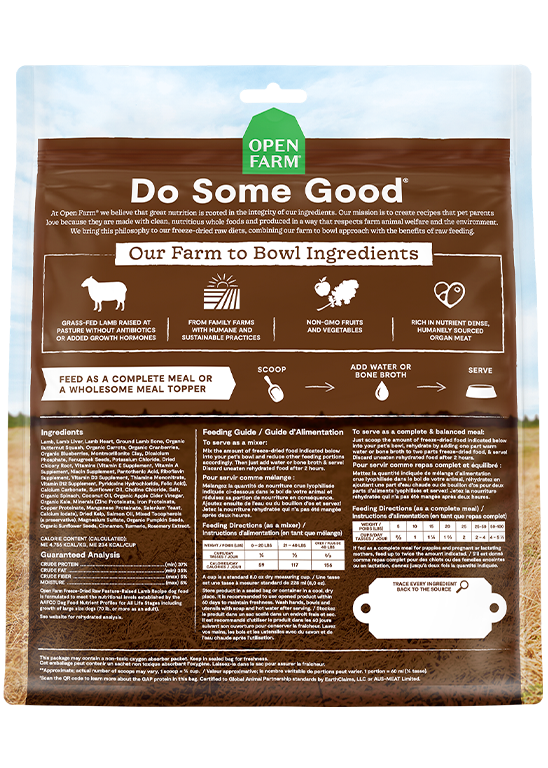 Open Farm Pasture-Raised Lamb Recipe dog food is formulated to meet the nutritional levels established by the AAFCO Dog Food Nutrient Profiles for all life stages.