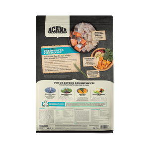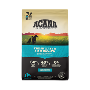 Our ACANA®recipes are thoughtfully crafted recipes from start to finish. ACANA Freshwater Fish recipe is balanced with 60%* quality animal ingredients like rainbow trout, catfish, and perch, and 40%+ fruits, vegetables, and botanicals. Artificial colors, flavors or preservatives are never added in our kitchen.