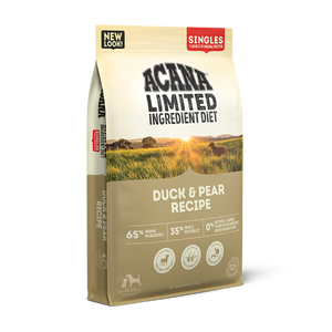 ACANA ™ Singles Limited Ingredient Diet Recipes are rich in protein from a single animal source, making them perfect for choosy dogs. Our Duck & Pear recipe is crafted with 65% animal ingredients1 from protein-rich duck including raw duck and duck liver to satisfy your dog’s cravings, and it contains no grain ingredients2. It’s also balanced with nutritious, fiber-rich vegetables and fruit including whole pears to help support your dog’s digestive health. Show your dog that a limited ingredient diet doesn’t mean less meat by feeding them ACANA Singles Limited Ingredient Diet Duck & Pear Recipe!