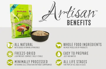 Mmmmmmm. Can you smell that delicious home-cooked meal? Your furry kids can! That warm, soothing feeling you get when you taste a home-cooked meal is something your pet will feel when they taste this delightful recipe. Artisan is our original food made with the highest-quality, whole food ingredients which is prepared in small batches in our family-owned kitchen in California. Artisan is a fantastic combination of digestibility and palatability making it a perfect way to introduce natural feeding into your pet’s diet. This all-natural, grain-free recipe is an ideal choice for a pet with food sensitivities or a picky eater. Your pet will give you extra kisses when they think you slaved over the stove making them this delicious and savory stew (and we won’t tell them that all you had to do was add warm water)!