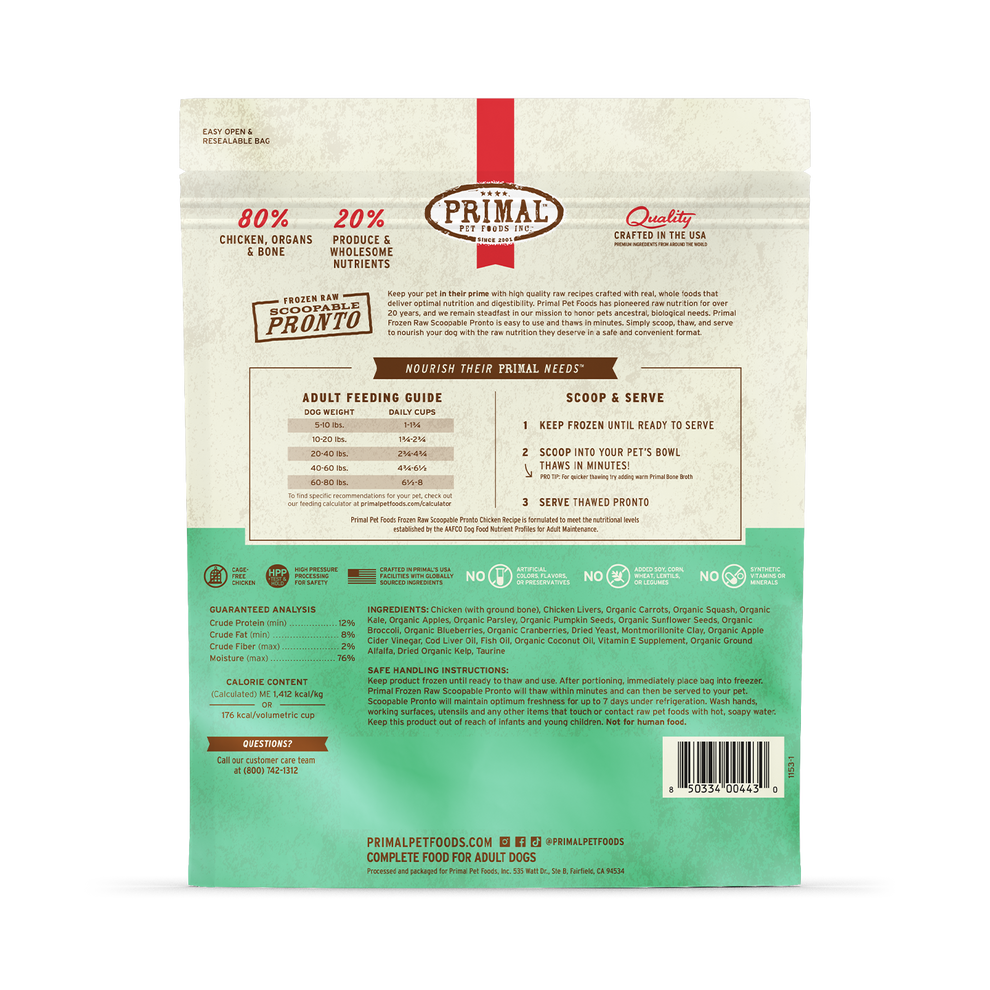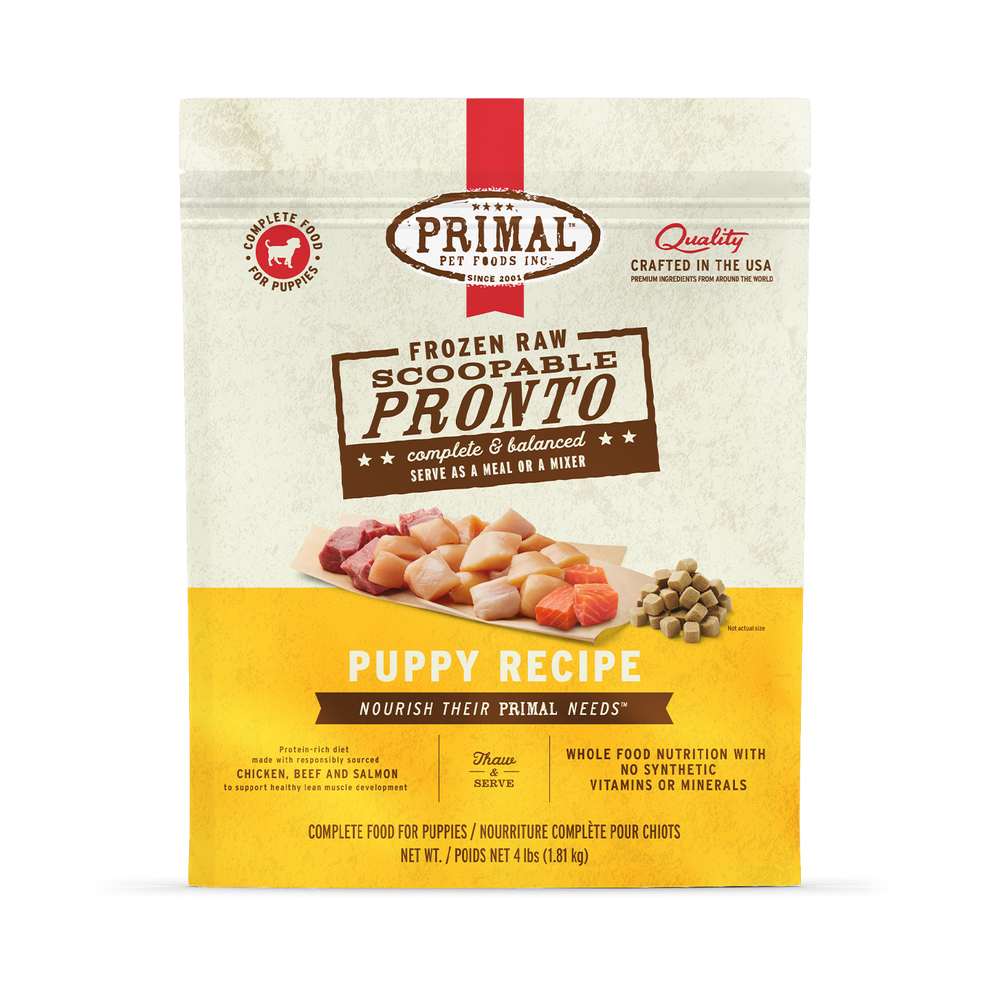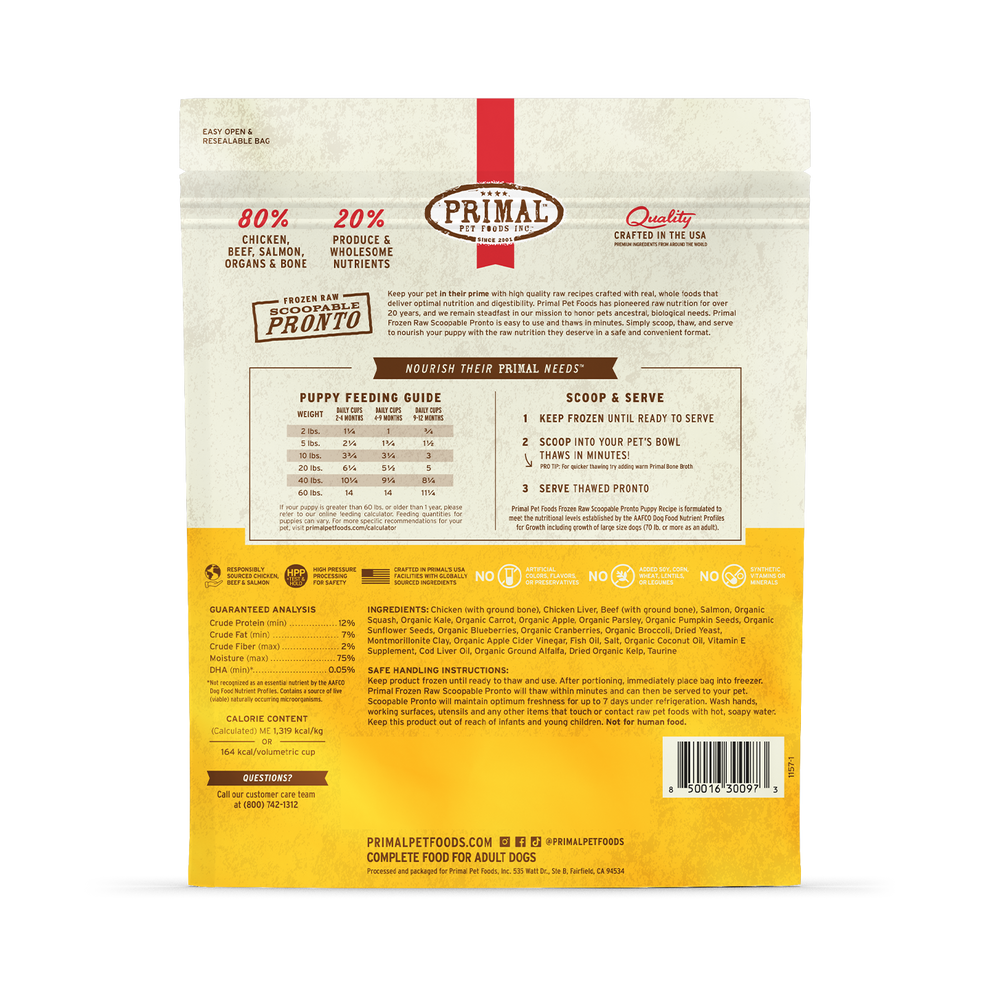Thaws in minutes and comes in a convenient, bite-sized, easy-to-portion format—just scoop and serve! Crafted with high-quality formula and Certified Organic produce for all of the nutrients your growing puppy needs to thrive. Available in 4lb resealable bags.