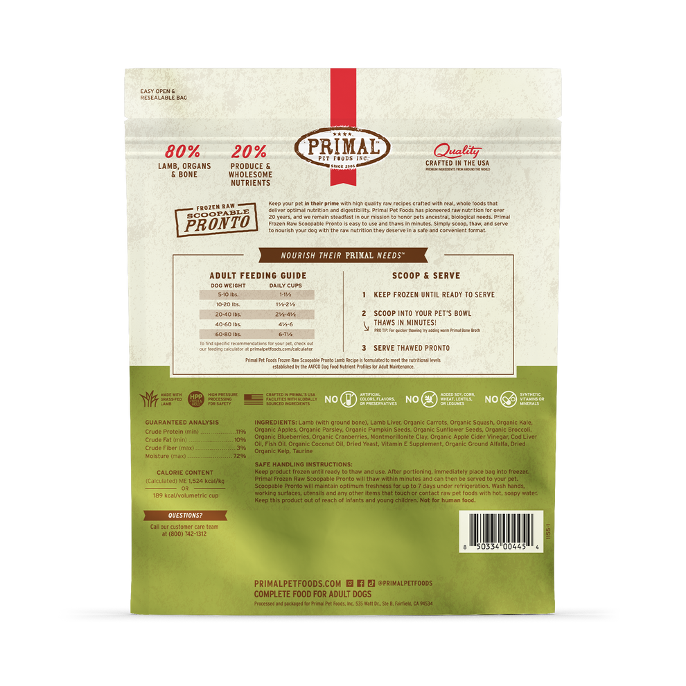 Lamb (with ground bone), Lamb Livers, Organic Carrots, Organic Squash, Organic Kale, Organic Apples, Organic Parsley, Organic Pumpkin Seeds, Organic Sunflower Seeds, Organic Broccoli, Organic Blueberries, Organic Cranberries, Montmorillonite Clay, Organic Apple Cider Vinegar, Cod Liver Oil, Fish Oil, Organic Coconut Oil, Dried Yeast, Vitamin E Supplement, Organic Ground Alfalfa, Dried Organic Kelp, Taurine
