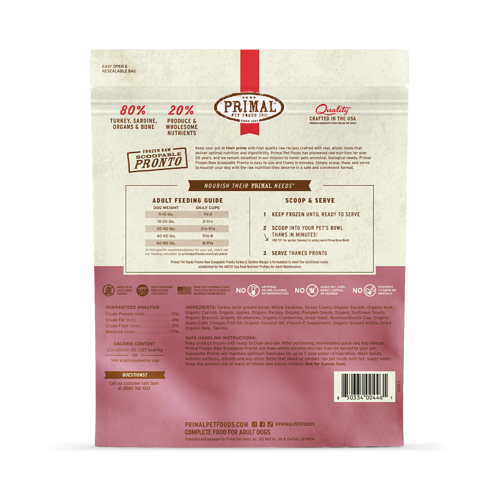 Turkey (with ground bone), Whole Sardines, Turkey Livers, Organic Squash, Organic Kale, Organic Carrots, Organic Apples, Organic Parsley, Organic Pumpkin Seeds, Organic Sunflower Seeds, Organic Broccoli, Organic Blueberries, Organic Cranberries, Dried Yeast, Montmorillonite Clay, Organic Apple Cider Vinegar, Fish Oil, Organic Coconut Oil, Vitamin E Supplement, Organic Ground Alfalfa, Dried Organic Kelp, Taurine