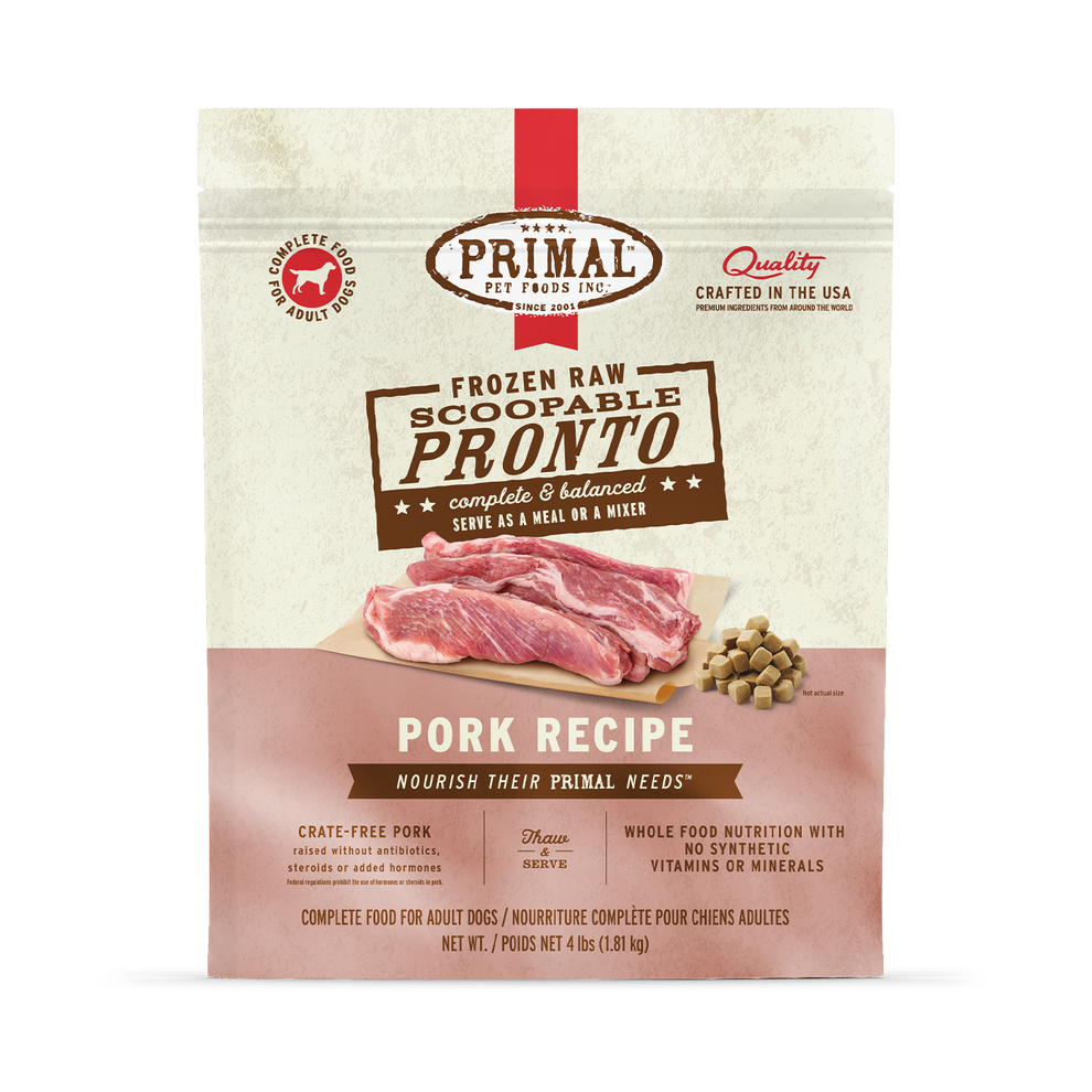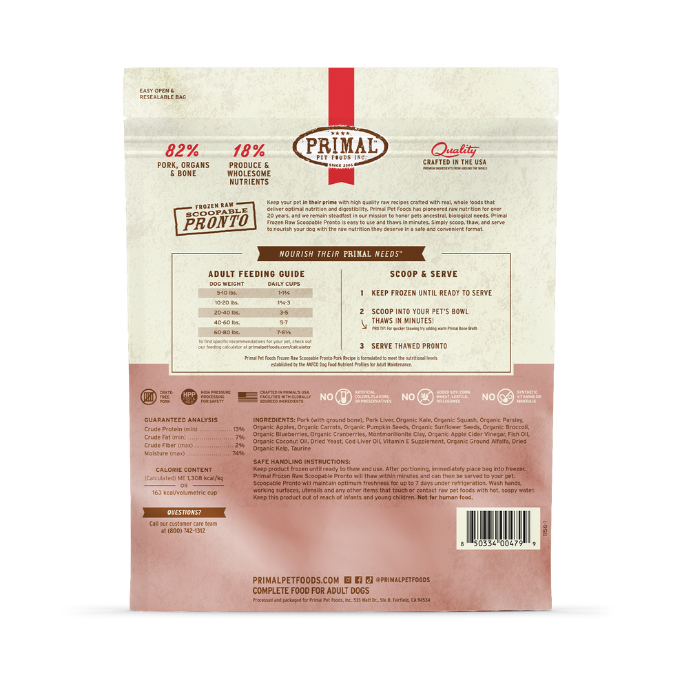 Pork (with ground bone), Pork Livers, Organic Kale, Organic Squash, Organic Parsley, Organic Apples, Organic Carrots, Organic Pumpkin Seeds, Organic Sunflower Seeds, Organic Broccoli, Organic Blueberries, Organic Cranberries, Montmorillonite Clay, Organic Apple Cider Vinegar, Fish Oil, Organic Coconut Oil, Dried Yeast, Cod Liver Oil, Vitamin E Supplement, Organic Ground Alfalfa, Dried Organic Kelp, Taurine