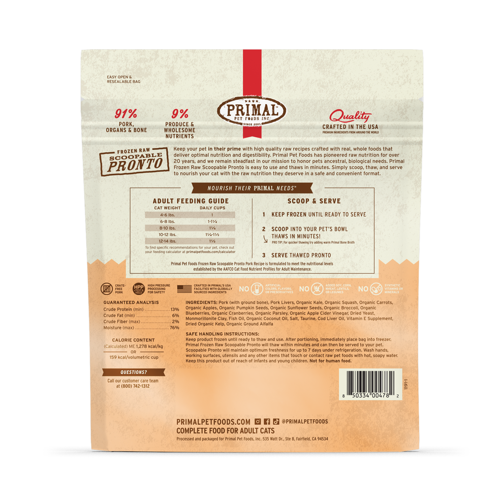 Thaws in minutes and comes in a convenient, bite-sized, easy-to-portion format—just scoop and serve! Made with high-quality protein and Certified Organic produce, formulated especially for your feline. Available in 1lb resealable bags.
