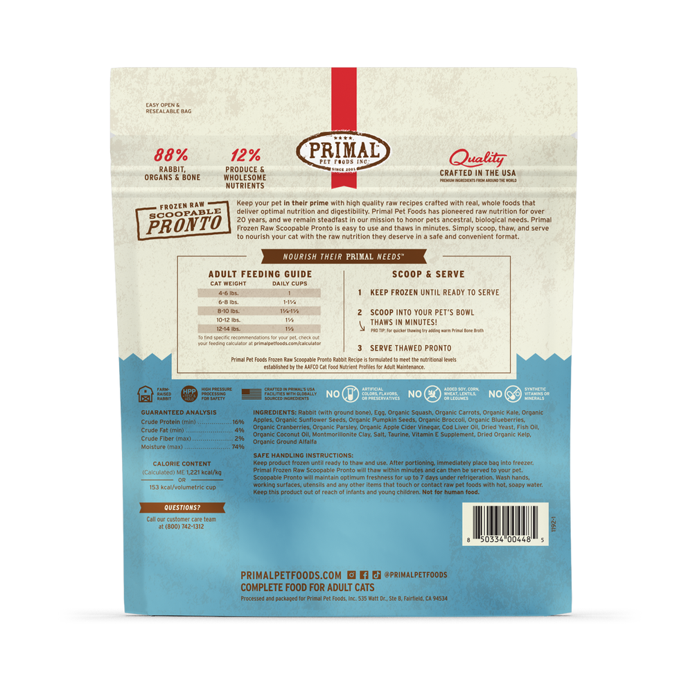 Rabbit (with ground bone), Egg, Organic Squash, Organic Carrots, Organic Kale, Organic Apples, Organic Sunflower Seeds, Organic Pumpkin Seeds, Organic Broccoli, Organic Blueberries, Organic Cranberries, Organic Parsley, Organic Apple Cider Vinegar, Cod Liver Oil, Dried Yeast, Fish Oil, Organic Coconut Oil, Montmorillonite Clay, Salt, Taurine, Vitamin E Supplement, Dried Organic Kelp, Organic Ground Alfalfa