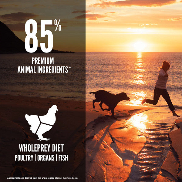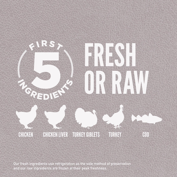 - First 5 ingredients always fresh or raw** protein including poultry, fish and organs