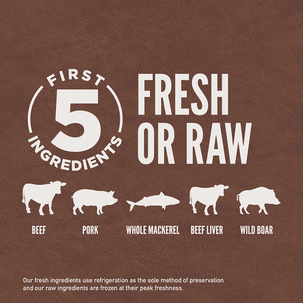 Beef, pork, whole mackerel, beef liver, wild boar, goat, lamb, lamb liver, beef tripe, wild boar liver, mutton, goat meal, beef meal, lamb meal, mackerel meal, beef kidney, mutton meal, whitefish meal, whole red lentils, whole pinto beans, beef fat, herring meal, natural fish flavor, whole peas, whole green lentils, whole navy beans, whole chickpeas, pollock oil, pea starch, lentil fiber, pork liver, pork kidney, lamb tripe, lamb kidney, wild boar heart, choline chloride, dried kelp, whole pumpkin, whole butternut squash, collard greens, whole apples, whole pears, zinc proteinate, vitamin E supplement, mixed tocopherols (preservative), thiamine mononitrate, niacin, pyridoxine hydrochloride, dried chicory root, turmeric, sarsaparilla root, althea root, rosehips, juniper berries, citric acid (preservative), rosemary extract, dried Lactobacillus acidophilus fermentation product, dried Bifidobacterium animalis fermentation product, dried Lactobacillus casei fermentation product.