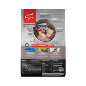 Help your pet thrive with the power of protein-rich recipes that nourish as nature intended. As obligate carnivores, all cats are meant to eat a Biologically Appropriate diet: one rich and varied in whole animal ingredients. ORIJEN® Fit & Trim recipe is optimized to support lean muscle mass and is specifically designed to support peak physical conditioning with quality animal ingredients from poultry and fish, organs, cartilage, and edible bone from fresh or raw free-run chicken and turkey*, and wild-caught fish. With rich inclusions of Wholeprey animals, ORIJEN cat food is made with the most nutrient-dense, succulent parts of the prey to deliver the nutrition cats need.