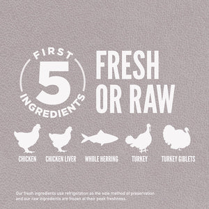 Chicken, chicken liver, whole herring, turkey, turkey giblets (liver, heart, gizzard), flounder, eggs, cod, dehydrated chicken liver, dehydrated egg, dehydrated sardine, dehydrated chicken, dehydrated turkey, dehydrated herring, whole red lentils, whole pinto beans, whole peas, whole navy beans, chicken fat, natural fish flavor, dehydrated pumpkin, lentil fiber, whole green lentils, whole chickpeas, chicken heart, pea starch, lentil starch, choline chloride, dried kelp, zinc proteinate, whole pumpkin, whole butternut squash, whole apples, whole pears, collard greens, mixed tocopherols (preservative), thiamine mononitrate, niacin, pyridoxine hydrochloride, vitamin E supplement, dried chicory root, turmeric, sarsaparilla root, althea root, rosehips, juniper berries, citric acid (preservative), rosemary extract, dried Lactobacillus acidophilus fermentation product, dried Bifidobacterium animalis fermentation product, dried Lactobacillus casei fermentation product.