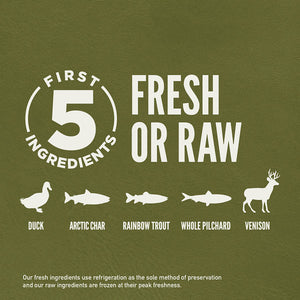 Duck, arctic char, rainbow trout, whole pilchard, venison, pork liver, duck liver, eggs, whitefish meal, blue whiting meal, herring meal, pork fat, lamb meal, mutton meal, whole green lentils, whole chickpeas, whole peas, lamb, goat, natural fish flavor, lamb liver, lentil fiber, pea starch, whole red lentils, whole pinto beans, duck meal, mackerel meal, pollock oil, lamb kidney, pork kidney, lamb tripe, vitamin E supplement, zinc proteinate, mixed tocopherols (preservative), dried kelp, whole pumpkin, whole butternut squash, collard greens, whole pears, whole apples, dried chicory root, turmeric, sarsaparilla root, althea root, rosehips, juniper berries, thiamine mononitrate, niacin, pyridoxine hydrochloride, citric acid (preservative), rosemary extract, dried Lactobacillus acidophilus fermentation product, dried Bifidobacterium animalis fermentation product, dried Lactobacillus casei fermentation product