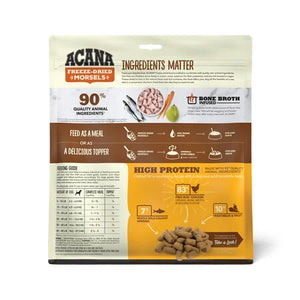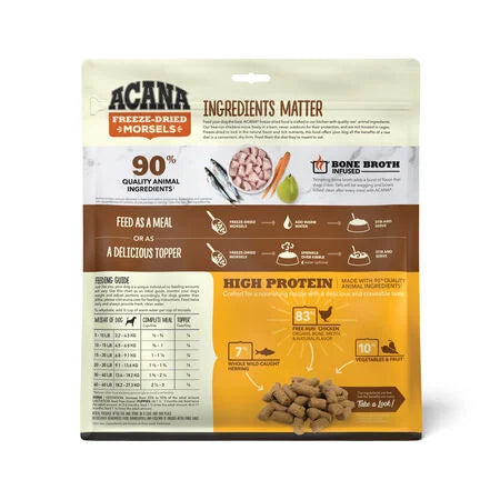 ACANA™ Freeze-Dried Food gives your dog all the benefits of raw nutrition, with none of the mess! Available in bite sized morsels or breakable patties, our high-protein Free-Run1 Chicken Recipe satisfies your dog’s natural cravings in a convenient, freeze-dried form. It’s made from 90% quality animal ingredients2 including free-run1 chicken, organs bone and broth, and balanced with wholesome vegetables and fruit. It’s also infused with hearty and delicious bone broth for a taste dogs love. Satisfy your dog’s cravings with the nutritious animal ingredients in ACANA Freeze-Dried Food!