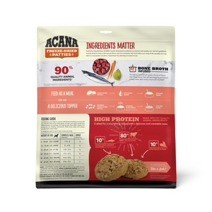 ACANA™ Freeze-Dried Food gives your dog all the benefits of raw nutrition, with none of the mess! Available in bite sized morsels or breakable patties, our high-protein Beef Recipe satisfies your dog’s natural cravings in a convenient, freeze-dried form. It’s made from 90% quality animal ingredients* including beef, organs, and bone, and balanced with wholesome vegetables and fruit. It’s also infused with hearty and delicious bone broth for a taste dogs love. Satisfy your dog’s cravings with the nutritious animal ingredients in ACANA Freeze-Dried Food!
