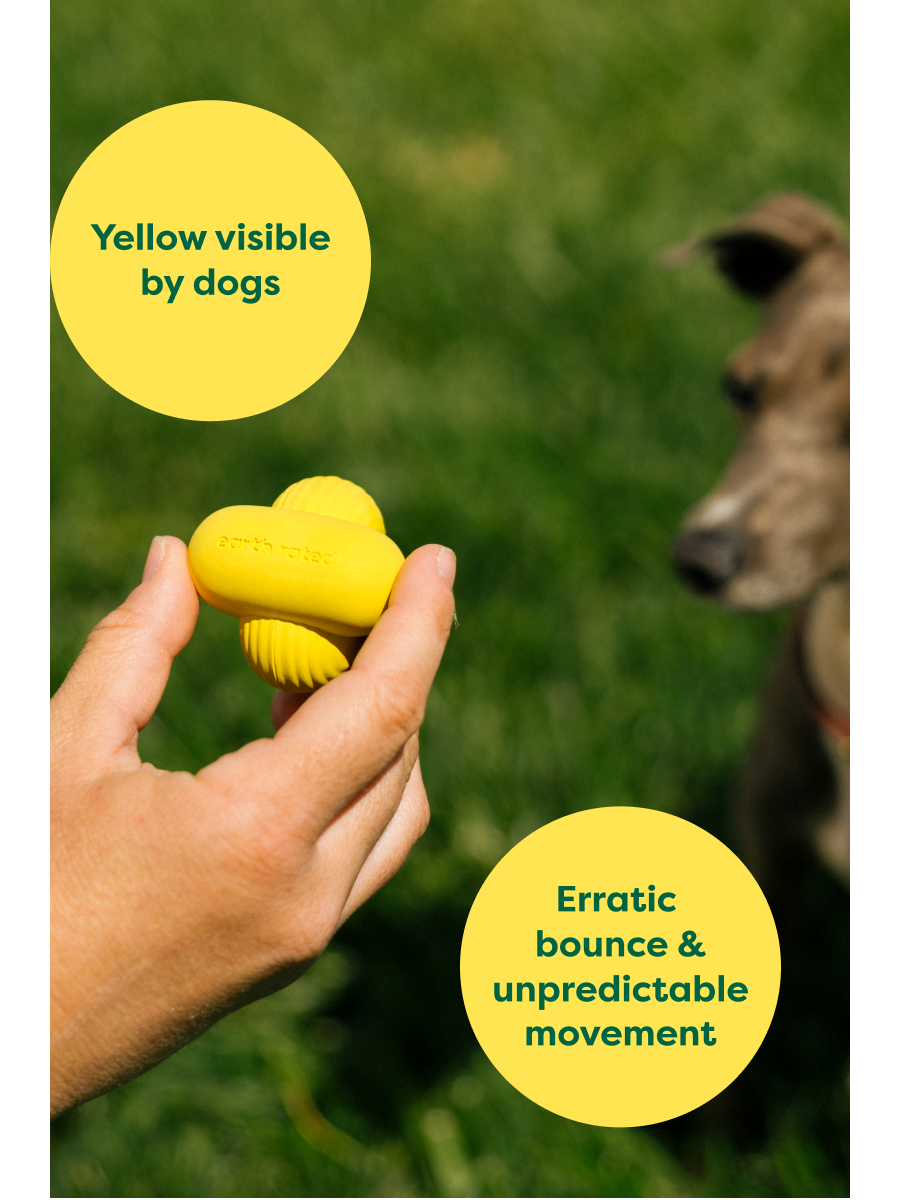 Unlike a tennis ball, its unique shape ensures natural airflow when held in the mouth. Its shape also provides an exciting and unpredictable bounce making play more stimulating. Dogs see yellow, so we made it yellow so they can easily spot it in the grass. Last but not least, it floats—providing a fun experience in water and on land.