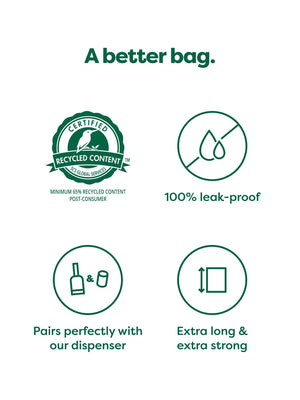 Poop Bags on Refill Rolls Use these bags on their own or pair with our dispenser for a seamless pick-up experience. Extra long, extra strong and 100% leak-proof guaranteed. Made from 65% certified post-consumer recycled plastic, they give a second life to more than 5 million pounds of landfill-bound plastic each year....