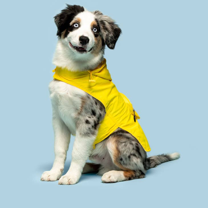 Your puppy loves splashing in puddles. And how could you blame him? But when he gets inside and shimmies his wet, muddy fur all over your brand new carpet, only this camo hooded raincoat can save him from getting in trouble. And maybe those puppy dog eyes. With our fabulous one-piece pack-away raincoat, you will never get caught in the rain unprepared again! You can take this travel-sized raincoat with you anywhere, and unfold it to a fully functional and totally fashionable raincoat to protect your pup 's soft fur from the rain! specs 100% waterproof nylon shell mesh lining adjustable toggle hood harness hole fabdog rubber tagging folds up into outer pocket for easy travel belly band velcro closure machine washable / lay flat to dry