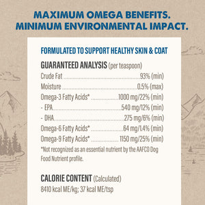 Our wild pollock oil boasts a very high content of the Omega-3 fatty acid EPA and a very low Omega-6 content—making it ideal to support a healthy skin and coat—which is often the main reason veterinarians refer pet owners to fish oil supplements.Â