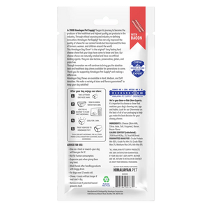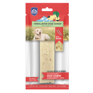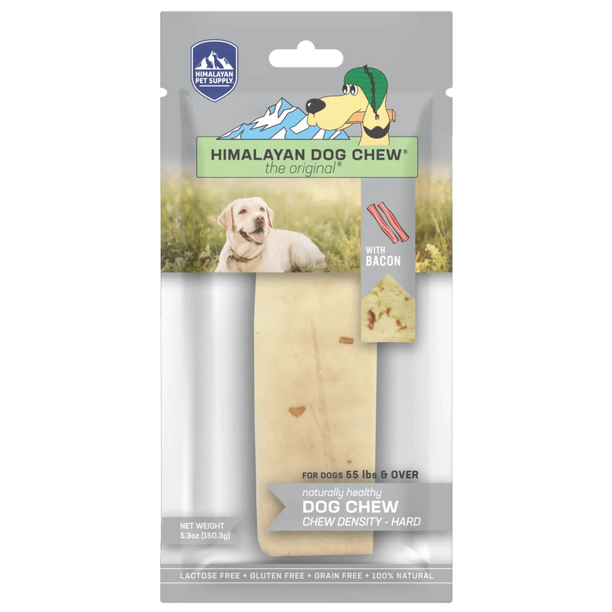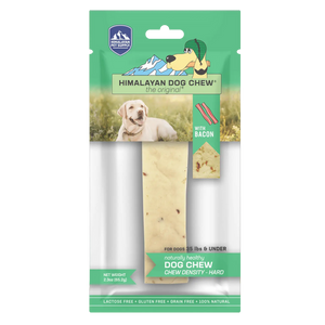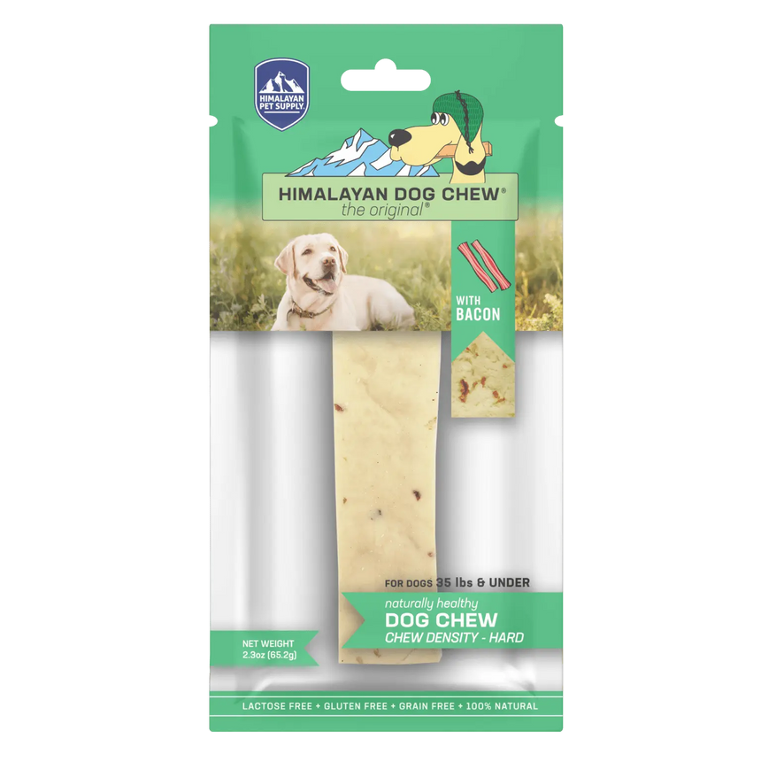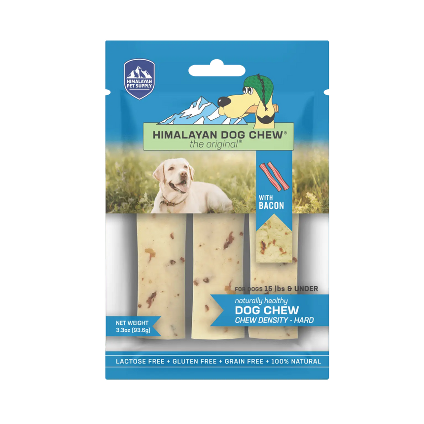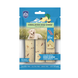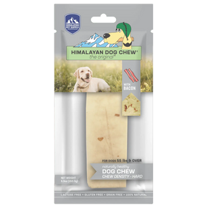 Himalayan Dog Chew Bacon is the original®, long-lasting, hard cheese chew that your dogs have come to know and love, with more flavor! Himalayan Dog Chew Bacon-flavored hard cheese chews are made using our traditional Himalayan Cheese recipe with added bits of bacon. Our chews are naturally smoked and have no artificial flavors or binding ingredients.