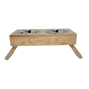 This classic, stylish and eco-friendly pet feeder is made from high-quality solid mango wood. The polished finish of the wood brings out the natural beauty of the wood grain. The dog feeder boasts two stainless steel bowls (Small = 12 fluid oz each / Medium = 24 fluid oz each) that are dishwasher safe and easy to clean. The open design of this elevated pet feeder allows your pets access the food or water at their desired level while preventing messes on your floor. The legs of the feeder are fold-able which makes it easy to store/stack the feeder when not in use.