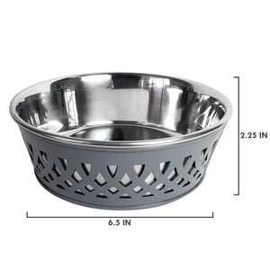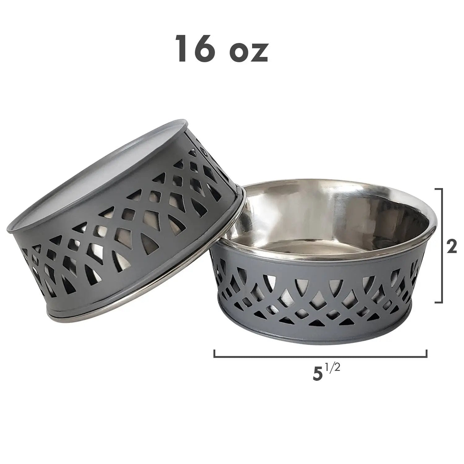 Appealing to those with good taste the powder coated Gray geometric patterned base has a unique laser cut country-inspired design. The nestled Stainless Steel Bowl (16 oz or 30 oz) is perfect for cats and dogs