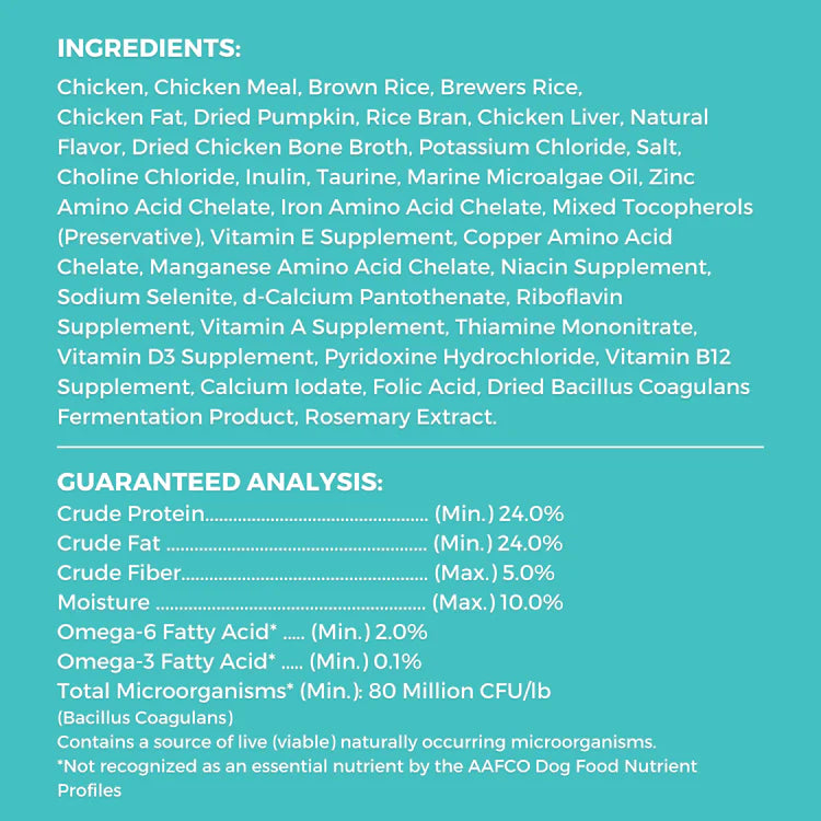 Chicken, Chicken Meal, Brown Rice, Brewers Rice, Chicken Fat, Dried Pumpkin, Rice Bran, Chicken Liver, Natural Flavor, Dried Chicken Bone Broth, Potassium Chloride, Salt, Choline Chloride, Inulin, Taurine, Marine Microalgae Oil, Zinc Amino Acid Chelate, Iron Amino Acid Chelate, Mixed Tocopherols (Preservative), Vitamin E Supplement, Copper Amino Acid Chelate, Manganese Amino Acid Chelate, Niacin Supplement, Sodium Selenite, d-Calcium Pantothenate, Riboflavin Supplement, Vitamin A Supplement, Thiamine Mononitrate, Vitamin D3 Supplement, Pyridoxine Hydrochloride, Vitamin B12 Supplement, Calcium Iodate, Folic Acid, Dried Bacillus Coagulans Fermentation Product, Rosemary Extract.