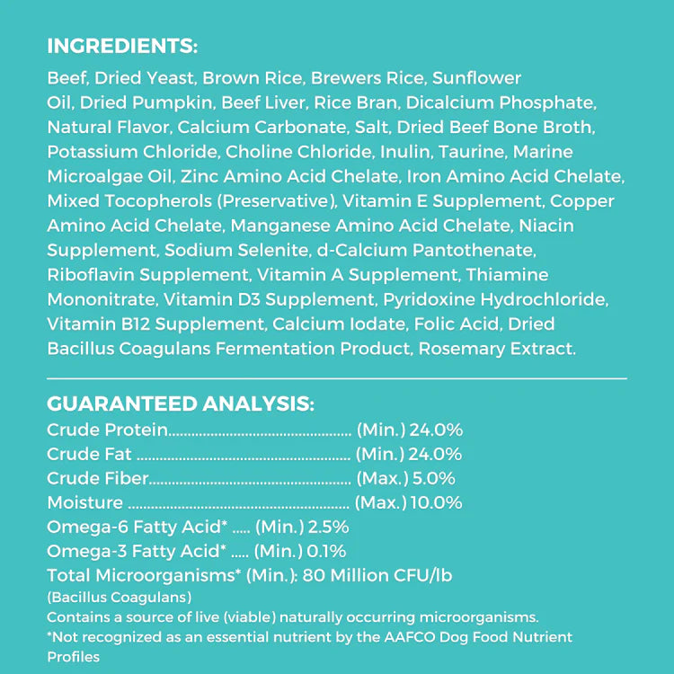 Beef, Dried Yeast, Brown Rice, Brewers Rice, Sunflower Oil, Dried Pumpkin, Beef Liver, Rice Bran, Dicalcium Phosphate, Natural Flavor, Calcium Carbonate, Salt, Dried Beef Bone Broth, Potassium Chloride, Choline Chloride, Inulin, Taurine, Marine Microalgae Oil, Zinc Amino Acid Chelate, Iron Amino Acid Chelate, Mixed Tocopherols (Preservative), Vitamin E Supplement, Copper Amino Acid Chelate, Manganese Amino Acid Chelate, Niacin Supplement, Sodium Selenite, d-Calcium Pantothenate, Riboflavin Supplement, Vitamin A Supplement, Thiamine Mononitrate, Vitamin D3 Supplement, Pyridoxine Hydrochloride, Vitamin B12 Supplement, Calcium Iodate, Folic Acid, Dried Bacillus Coagulans Fermentation Product, Rosemary Extract.