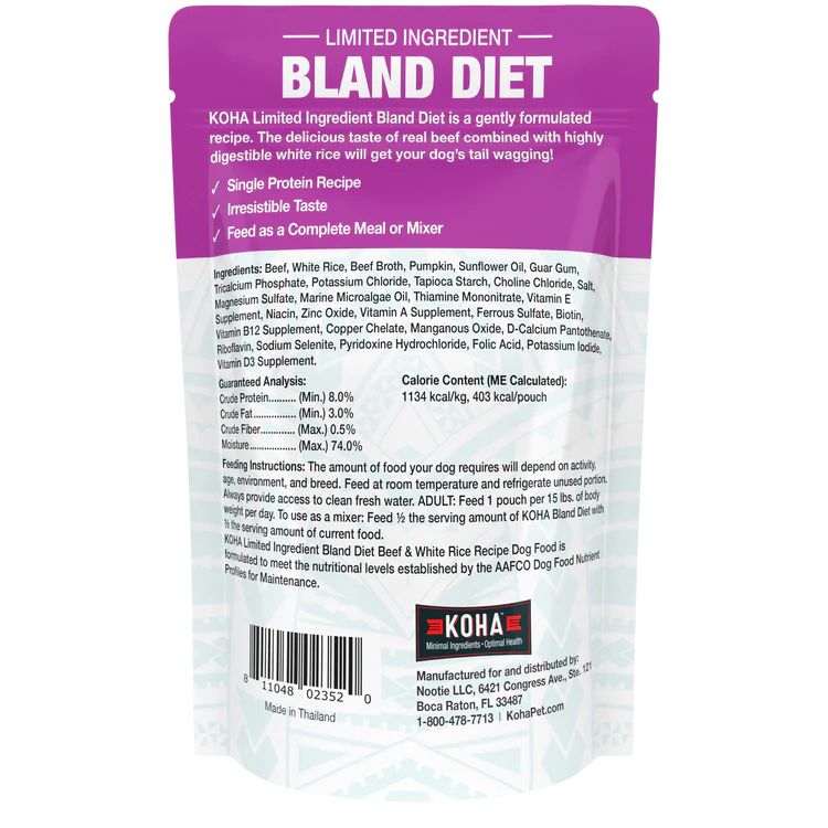 KOHA Limited Ingredient Bland Diet Beef & White Rice Recipe Dog Food is formulated to meet the nutritional level established by the AAFCO Dog food Nutrient Profiles for Maintenance. Made in Thailand