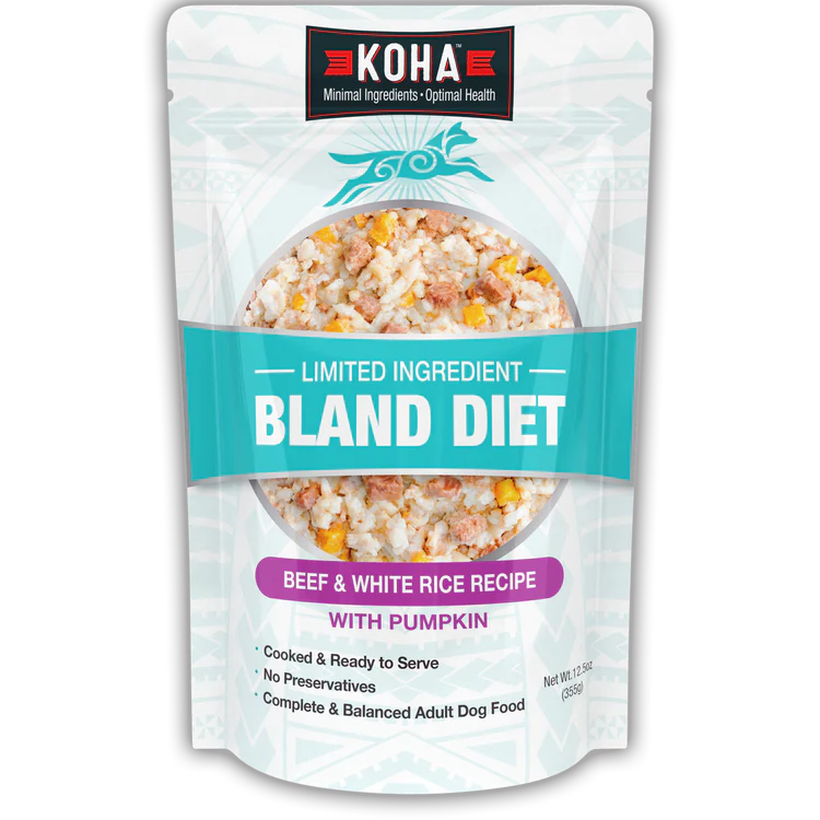 KOHA Bland Diet for dogs is ideal for dogs with upset stomach, loose stool, or diarrhea. This gently formulated limited ingredient dog food recipe has just one protein source for easy digestion. It also includes white rice and pumpkin to support healthy stools and regularity.
