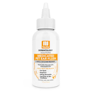 Nootie Medicated Ear Flush for dogs and cats treats and relieves symptoms due to skin infections caused by bacteria, fungi, and yeast build up. This topical ear treatment uses veterinarian strength active ingredients Chlorhexidine Gluconate and Ketoconazole to provide maximum results. Use at the first sign of skin irritation to prevent infections in dog and cat ears or to target troubled skin areas. Apply solution on a cotton pad and wipe ears and skin to treat inflamed or irritated skin.
