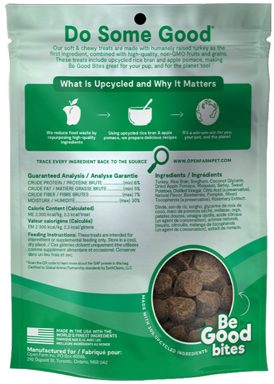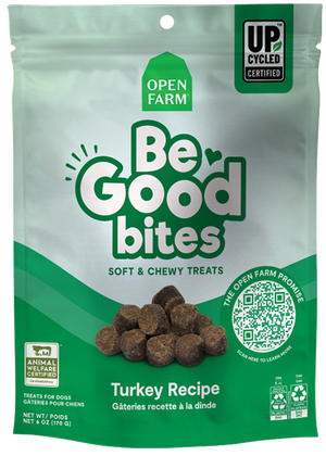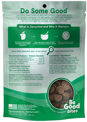 Our Turkey Recipe Soft & Chewy treats are made with humanely raised turkey as the first ingredient, combined with high-quality non-GMO fruits & grains. These treats included 30% upcycled ingredients, making Be Good Bites great for your pup and the planet too!