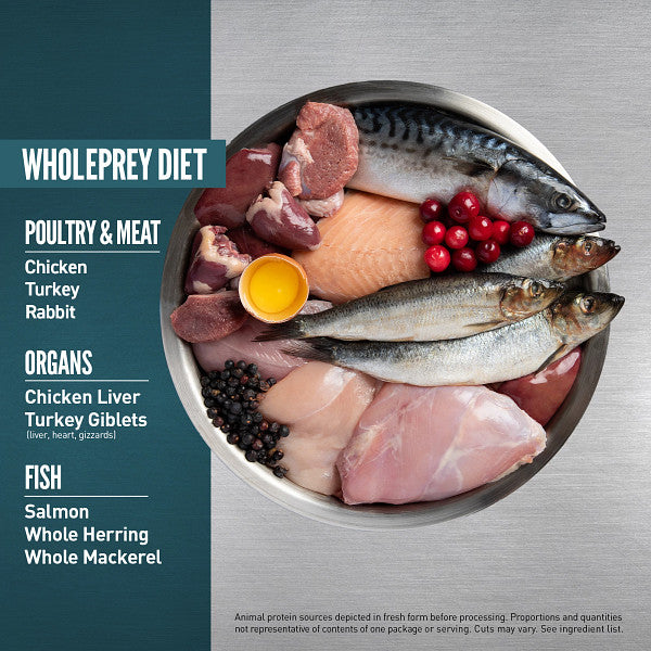 - Our authentic WholePrey diet features the most succulent parts of the prey like poultry or fish, organs and bone to mimic what your cat’s ancestors consumed in the wild.