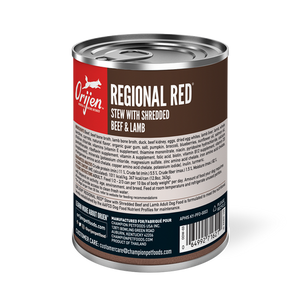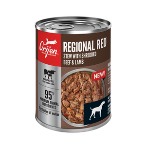 ORIJEN®Regional Red Stew is a nourishing wet food rich inclusions of meat shreds that will help your dog thrive. Packed with 95%* premium animal ingredients, ORIJEN Regional Red Stew includes fresh or raw animal ingredients like beef and lamb. This includes succulent WholePrey ingredients like organs and bone to add a source of essential vitamins, minerals and amino acids. Feed your dog ORIJEN Premium Wet Dog Food alone to add moisture and nourishment to their diet, or add it on top of their favorite ORIJEN kibble for a nutritious addition at mealtime.