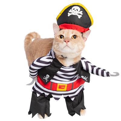Perfect for the next time they set sail for an adventure to the backyard to search for buried treasure, your dog and cat will look their best for Halloween with this dog pirate costume! This costume set comes with two pieces: a pirate hat (with skull and crossbones obviously) and a black and white striped pirate bodysuit. The bodysuit is designed to look like a complete outfit with a vest, pants, and a belt. It attaches behind the pet's neck with an adjustable hook and loop closure. The hat has an adjustable elastic strap to secure your dog's head comfortably. This costume is available in sizes Small, Medium, Large, and Extra Large to fit a wide range of pets.