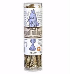 At Polkadog, we're all about locally-sourced, made-in-the-USA, limited ingredient natural dog treats. Our super-duper fish skin dog treats are no exception. The cod we use to make these cod skins for dogs is wild caught in season by local fishermen on small boats in Alaska. We hand-roll and slowly dehydrate each skin in our Boston kitchen to create these savory, healthy cod skin treats.