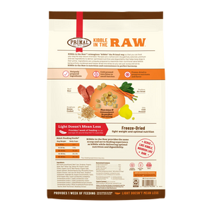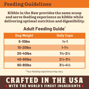 Kibble in the Raw reimagines “kibble” the Primal way so that you can feed your dog the way nature intended. Recipes are crafted with thoughtfully selected, premium and raw ingredients to deliver optimized nutrition and digestibility while providing the same scoop and serve feeding experience as kibble.