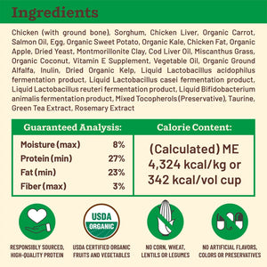 Chicken (with ground bone), Sorghum, Chicken Liver, Organic Carrot, Egg, Organic Sweet Potato, Salmon Oil, Organic Kale, Chicken Fat, Organic Apple, Dried Yeast, Montmorillonite Clay, Miscanthus Grass, Organic Coconut, Cod Liver Oil, Vitamin E Supplement, Vegetable Oil, Organic Ground Alfalfa, Inulin, Dried Organic Kelp, Liquid Lactobacillus acidophilus fermentation product, Liquid Lactobacillus casei fermentation product, Liquid Lactobacillus reuteri fermentation product, Liquid Bifidobacterium animalis fermentation product, Mixed Tocopherols (Preservative), Taurine, Green Tea Extract, Rosemary Extract