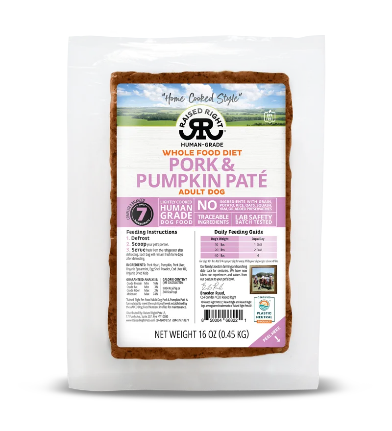 Our Adult Dog Pork & Pumpkin Paté is formulated to meet the nutritional levels established by the AAFCO Dog Food Nutrient Profiles for maintenance. Calorie content (ME Calculated): 240 kcals / cup (1,064 kcals / kg)