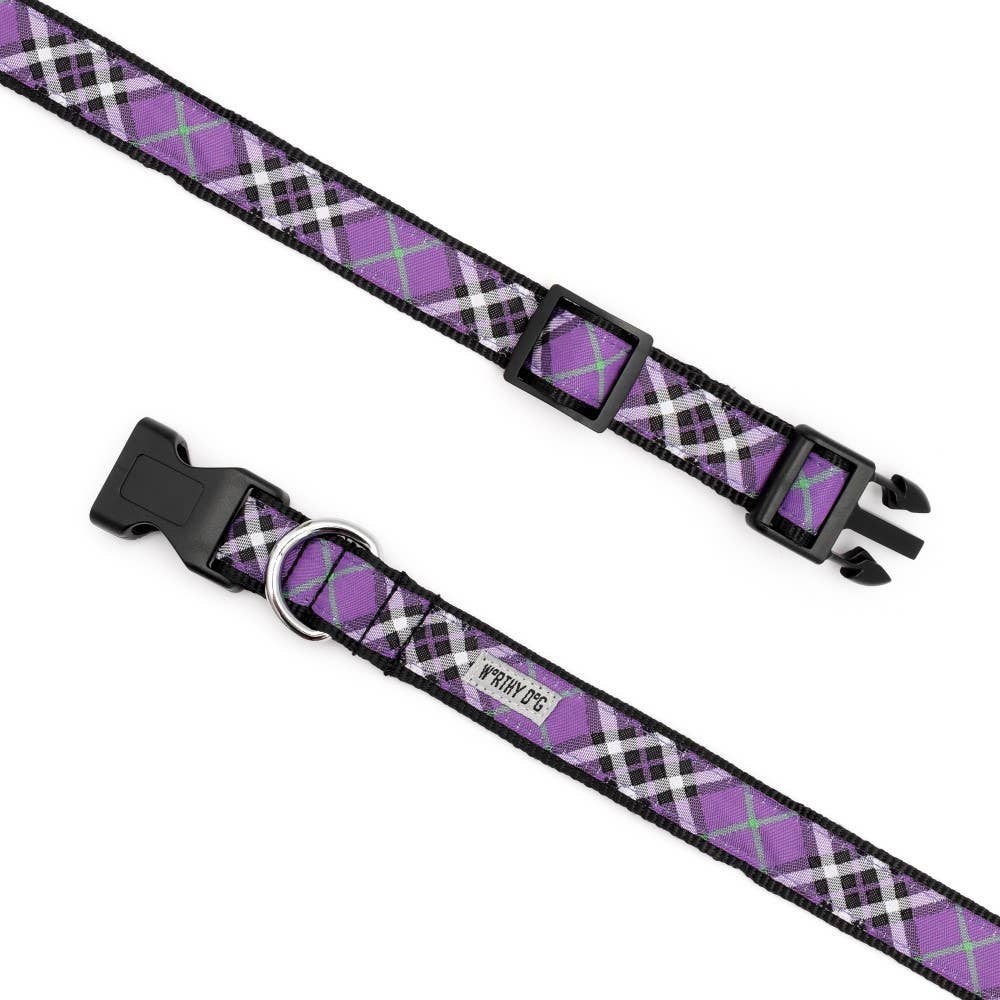 The worthy dog's collars are focused on style and durability! This collar is perfect for everyday wear, featuring woven patterned ribbon sewn onto comfortable and strong nylon webbing with a secure plastic quick release buckle and a nickel-plated d-ring to easily attach tags or a leash. Comfortable to wear and easy to take on and off. available in multiple sizes with a wide range of adjustability, helping you find the perfect fit for your pup! Don't forget the matching leash!