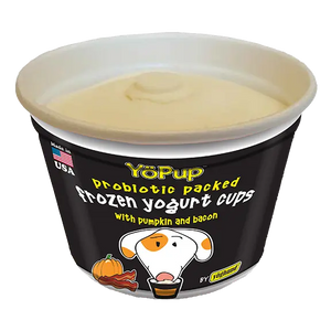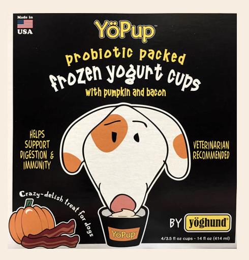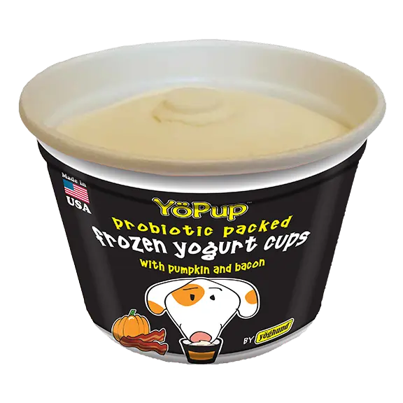 This flavor combination is a home run for dogs! In addition to the known benefits of yogurt, we have added pumpkin; a yummy taste and a great source of fiber that helps with digestive regularity and tummy issues. Then comes the irresistible taste of bacon, just because dogs can’t get enough! Don’t be surprised when your best friend starts worshiping the freezer, waiting for the next yummy cup of Pumpkin & Bacon YöPup.